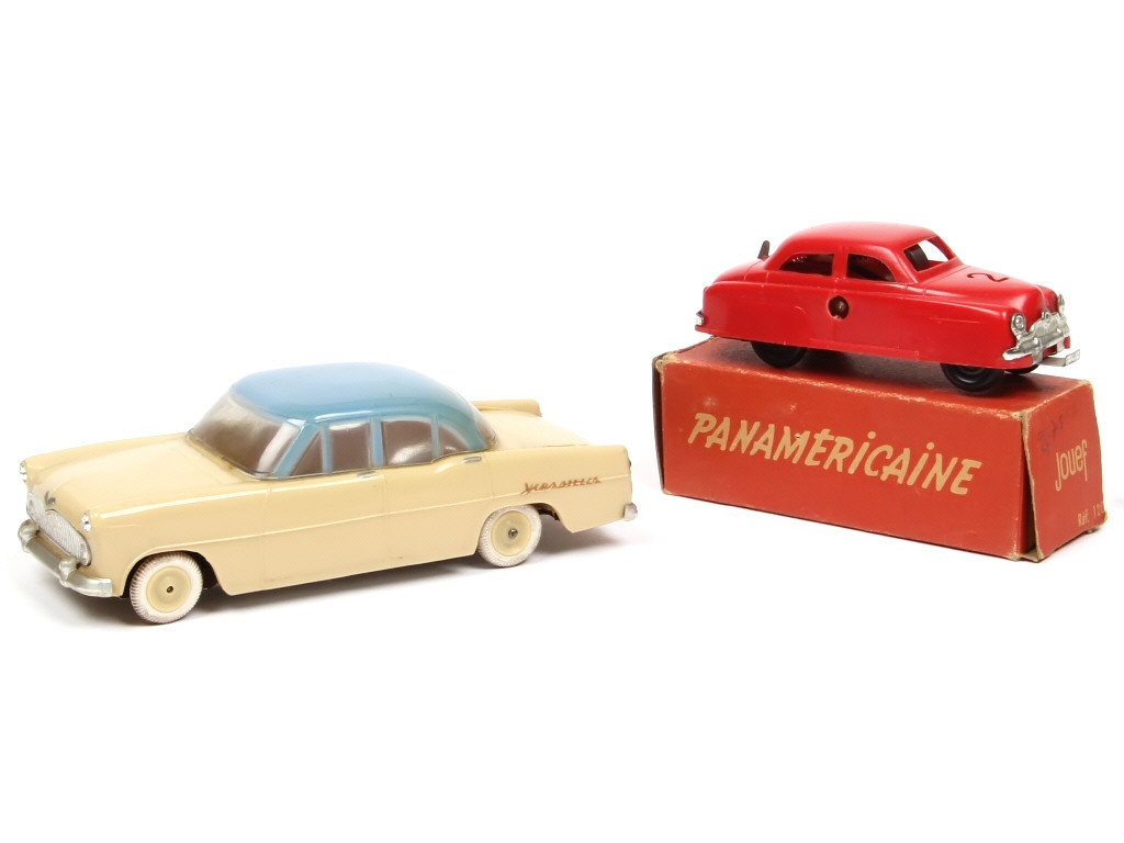 comprend : SIMCA VERSAILLES (moteur à friction fonctionne - malle arrière collée avec petite fêlure - carrosserie légèrement jaunie) & PANAMERICAINE -(moteur à clef fonctionne) - on y retrouve les marques : MINIALUXE & JOUEF