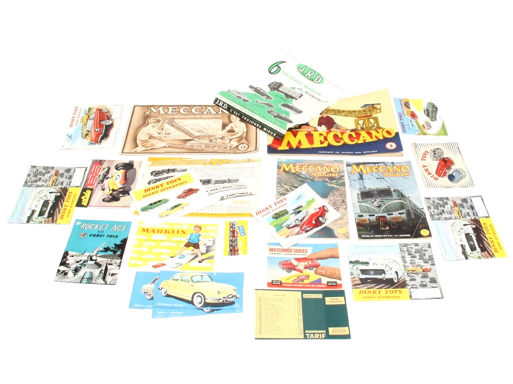 états de 'b' à 'c' - comprend : images, affichettes publicitaires, catalogues, manuel d'instructions, magazines & notices - on y retrouve notamment les marques : DINKY TOYS, JRD, MECCANO, JEP, SOLIDO, RAILROUTE, CORGI TOYS - quelques petits accrocs sur certains exemplaires - 2 exemplaires incomplets & un autre avec importantes traces d'humidité sur une page