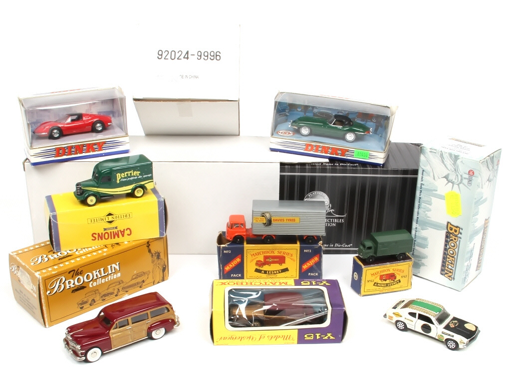 différentes échelles - miniatures reproduisant notamment les modèles : MACK, BEDFORD, WESLEY, DE SOTO & FERRARI - on y retrouve notamment les marques : DINKY MATCHBOX, BROOKLIN, MATCHBOX (manque une décoration) & CORGI TOYS - un exemplaire sans boite en état 'E' - boites en états 'a' à 'e'