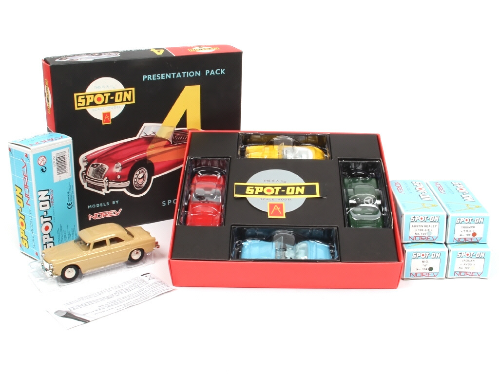 contient : AUSTIN HEALEY, MGA, JAGUAR XKSS & TRIUMPH TR3 - avec cales - série limitée à 1000 exemplaires - on y joint 5 voitures de la marque (MGA, JAGUAR, TRIUMPH, AUSTIN & ROVER)