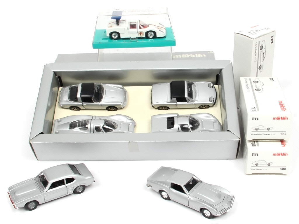 productions récentes - miniatures reproduisant les modèles : CHEVROLET, FORD, OPEL, CHAPARRAL (production originale en état 'A--'c') & PORSCHE (exemplaires regroupés dans un coffret état 'b')