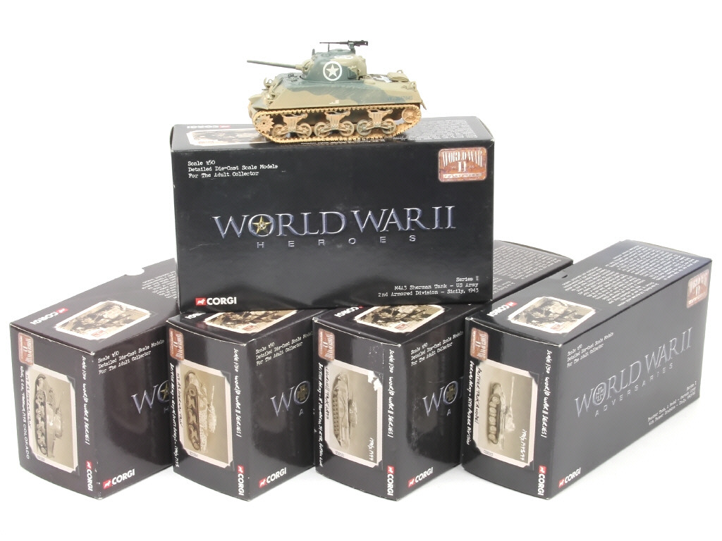 comprend les modèles : SHERMAN M4A3 (3 modèles différents), PANTHER & CHURCHILL - étiquettes arrachées sur les boîtes - avec notices & certificats
