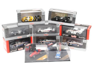 comprend les modèles : JAGUAR (2 modèles différents), PORSCHE (5 modèles différents), FERRARI, MATRA (boîte cassée) & PEUGEOT - quelques étiquettes arrachées sur les boîtes