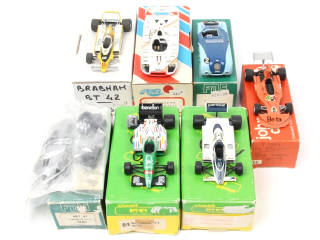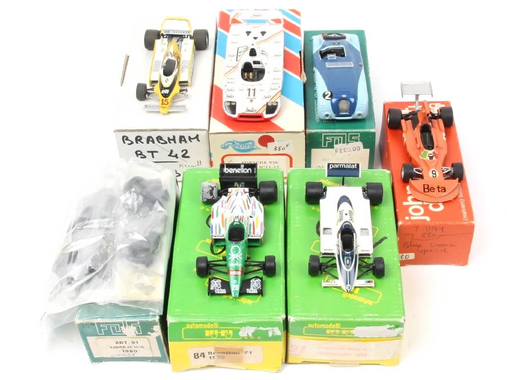 comprend les modèles : RENAULT, BRABHAM, BUGATTI, MARCH, LIGIER (kit à monter), PORSCHE & BENETTON - on y retrouve les marques : FDS, SIBUR, RECORD & HIFI - possibilités de manques & parties cassées - 3 boîtes non conformes