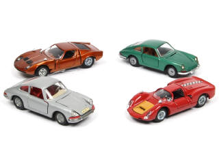 miniatures reproduisant les modèles : PORSCHE (3 exemplaires différents dont un avec 3 petits décalques ajoutés & quelques petits accessoires manquants & un autre avec bas de caisse retouchés) & LAMBORGHINI - on y retrouve les marques : MEBETOYS & POLITOYS