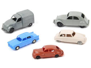 petites échelles - comprend : CITROËN 2CV (2 exemplaires différents), PEUGEOT 203 (petites cassures & fêlures par endroits) & 404 - on y joint une CITROËN DS 19 de la marque INGAP