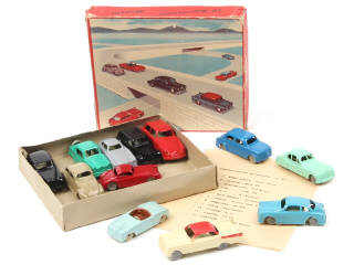 échelle approximative 1/75ème - contient : ROLLS ROYCE SILVER CLOUD, JAGUAR MARK VII, VOLKSWAGEN 113, FIAT 1100, MGA, ALFA ROMEO GUILIETTA SPRINT (plancher collé à l'envers), LANCIA AURELIA (sans pare-brise), MERCEDES 300 SL, NASH METROPOLITAN, CITROËN TRACTION, DS 19 & CHRYSLER IMPERIAL - avec notice - petits défauts de peinture d'origine par endroits