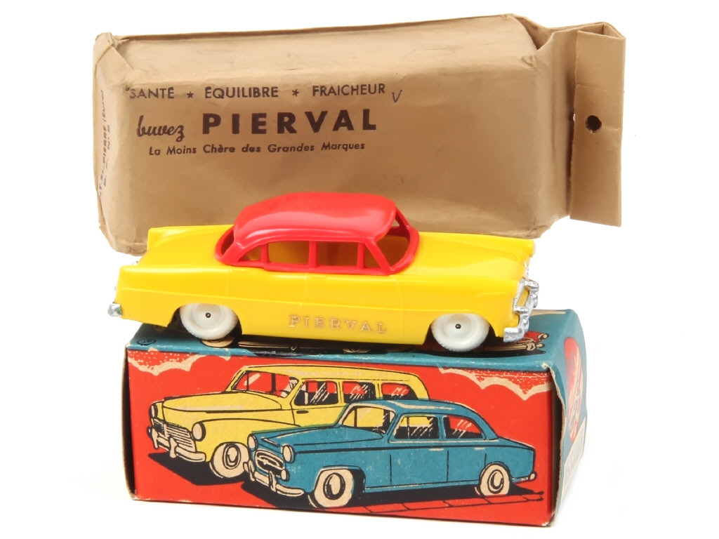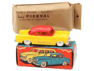 la mention 'PIERVAL' est gravée en lettres dorées sur le côté droit de la voiture - avec rarissime emballage postal d'origine daté du 13/12/60 - carrosserie très légèrement déformée - avec mention 'VERSAILLES' sur les rabats de boîte