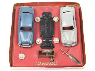 première version sans vitre ni aménagement intérieur - contient : 2 carrosseries de RENAULT FREGATE, un châssis, un moteur à friction (légèrement oxydé), 5 pneus & un tournevis - avec cale de présentation (manque bulle plastique de coffret, un logo de la marque sur le socle & une partie d'un mot)
