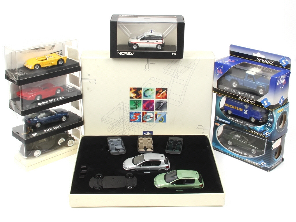 comprend les modèles : BMW (phares à refixer), ROLLS ROYCE, ALFA ROMEO, RENAULT, LAND ROVER, FIAT & PEUGEOT - on y retrouve les marques : SOLIDO & NOREV - possibilité de petits manques
