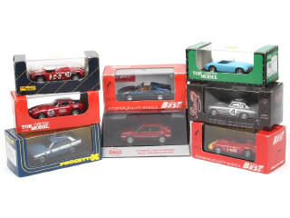 miniatures reproduisant les modèles : FERRARI, MERCEDES, ALFA ROMEO & GORDINI - on y retrouve les marques : MODEL BEST, TOP MODEL, PROGETTO K, BANG & PEGGO - les boîte sont en état de 'b' à 'c' (quelques suremballages plus ou moins endommagés)