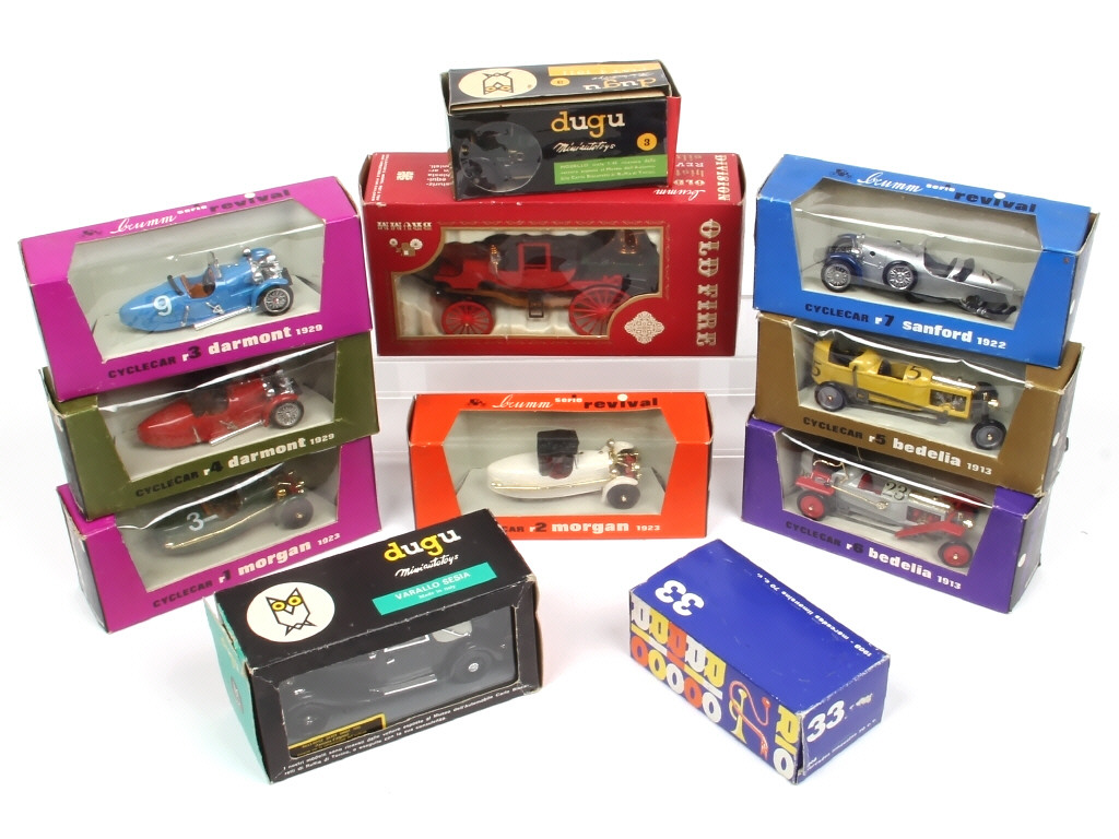 miniatures reproduisant notamment les modèles : MERCEDES, DARMON, BEDELIA, MORGAN, SANFORD (parties désolidarisées) & ROLLS ROYCE - on y retrouve les marques : BRUMM, RIO & DUGU - les boîtes sont en état 'b' avec petits frottements & accrocs par endroits