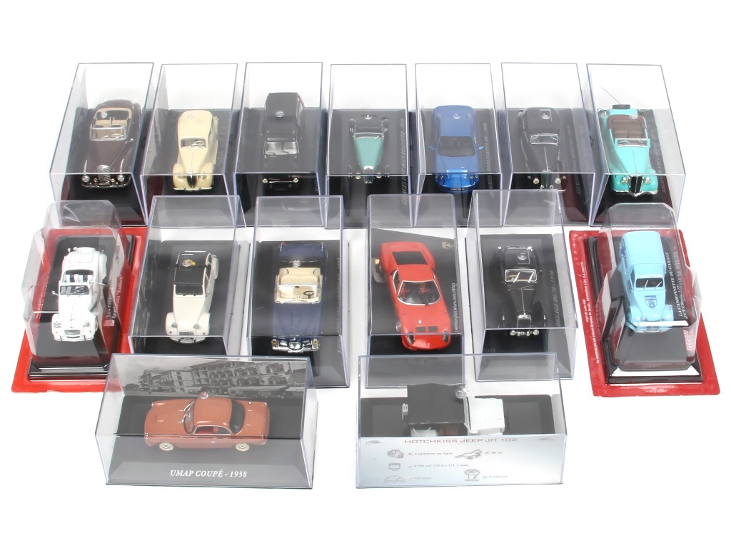 modèles vendus en kiosque - miniatures reproduisant notamment les modèles : CITROEN, SALMSON, MATRA, MERCEDES (manque sigle de calandre), DELAGE & LAMBORGHINI - on y retrouve notamment la marque EDITIONS HACHETTE - 2 boites en état 'c'