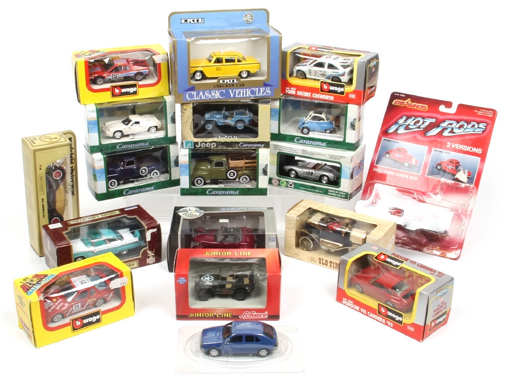 miniatures reproduisant notamment les modèles : RENAULT, JEEP, LOTUS, PORSCHE & FORD - on y retrouve notamment les marques : ERTL, MAJORETTE, BBURAGO & MATCHBOX - les boites sont en état de 'a' à 'c'