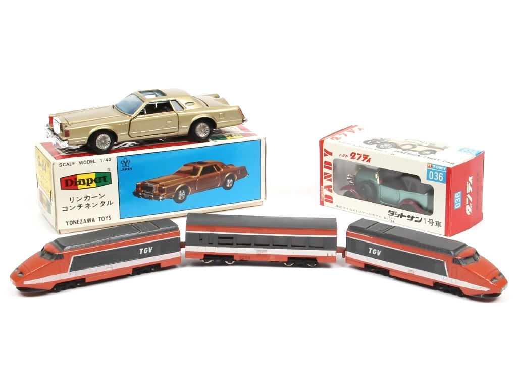 comprend : rame TGV (RARE), DATSUN & LINCOLN - on y retrouve les marques : TOMICA DANDY & YONEZAWA TOYS DIAPET (un exemplaire avec un autocollant manquant & sans boîte)