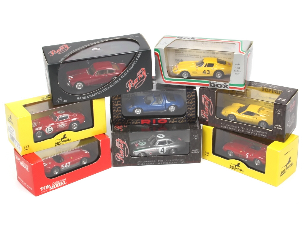 miniatures reproduisant les modèles : FERRARI, LAMBORGHINI & MERCEDES - on y retrouve les marques : RIO, MODEL BOX, BANG, ART MODEL & TOP MODEL - une petite fêlure sur un couvercle de boite - quelques accrocs (légers) sur les suremballages