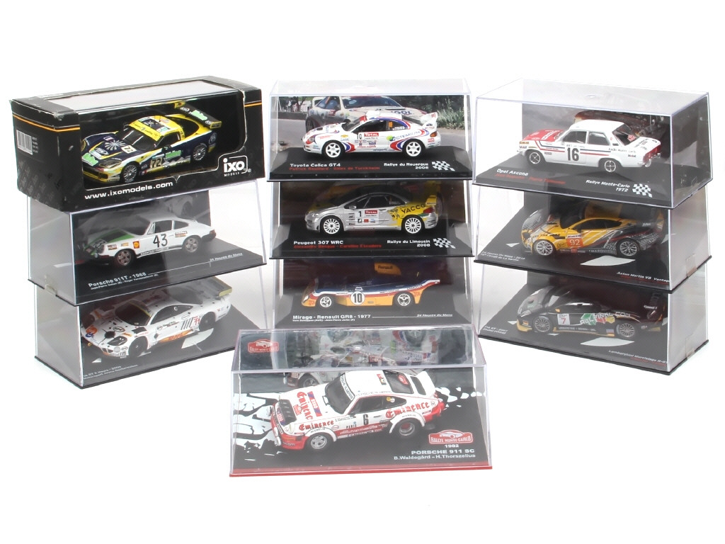 3 exemplaires Le Mans - miniatures reproduisant notamment les modèles : PORSCHE, PEUGEOT, OPEL, CHEVROLET & RENAULT - une boite en état 'c' - on y retrouve notamment la marque IXO (accrocs sur le suremballage)