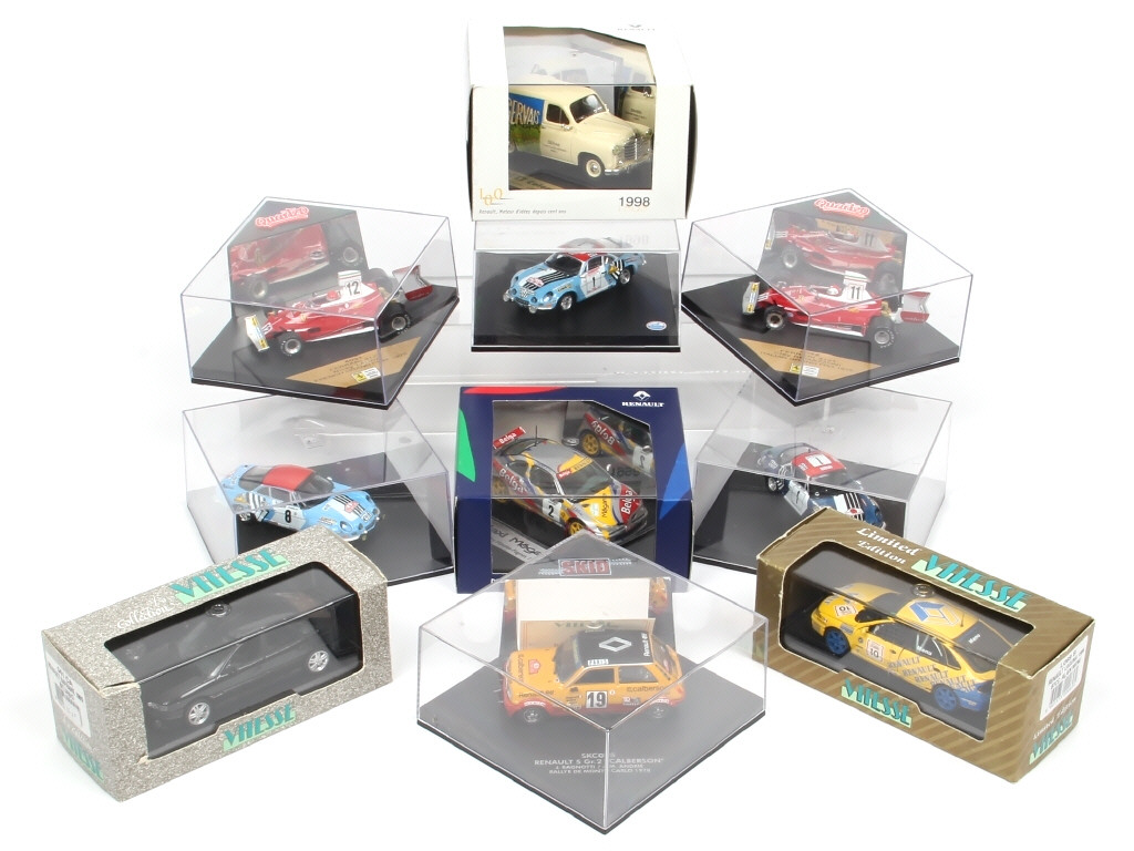3 exemplaires en série limitée - miniatures reproduisant les modèles : RENAULT, ALPINE & FERRARI - on y retrouve les marques : VITESSE, TROFEU & QUARTZO - un suremballage en état 'c'