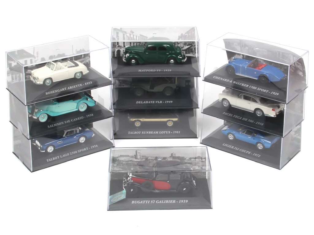 miniatures reproduisant notamment les modèles : CHENARD & WALKER, MATFORD, ROSENGART, SALMSON, TALBOT, DELAHAYE, LIGIER & BUGATTI - une petite fêlure sur un couvercle de boite