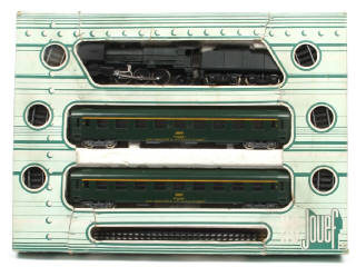 non testé - contient : une locomotive à vapeur type 231 avec tender (attelage cassé), 2 voitures de voyageurs & 9 rails courbes - petites traces d'oxydation par endroits - quelques petits accessoires manquants