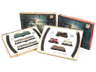 non testé - comprend : locomotive-tender à vapeur, motrice 9201, 2 voitures voyageurs, 3 wagons de marchandises & 12 rails courbes - plus ou moins encrassés - quelques petits manques & parties cassées - traces d'oxydation