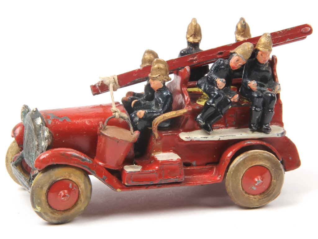 version avec roues à pneus (séchés & endommagés) - production en plomb des années 30 - avec 6 pompiers & échelle amovible - calandre ternie