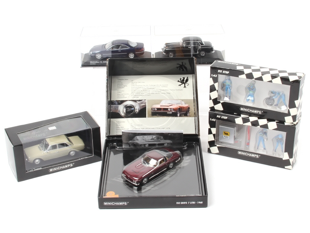 miniatures reproduisant les modèles : MERCEDES, FORD & ISO - 3 exemplaires en séries limitées - manque 2 suremballages - on y joint 2 coffrets contenant 5 figurines & 2 accessoires F1 de la marque