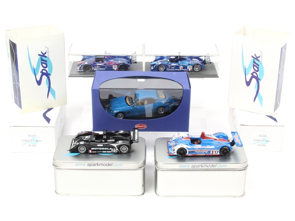 miniatures reproduisant les modèles : COURAGE & LOLA - on y joint une BUGATTI de la marque AUTOART