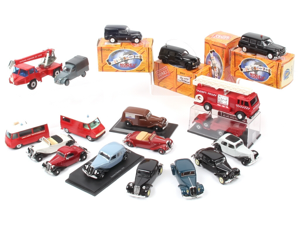 miniatures reproduisant notamment les modèles : CITROËN (principalement) & PEUGEOT - on y retrouve notamment les marques : NOREV (kiosque) & SOLIDO - quelques petits manques - avec 4 boîtes