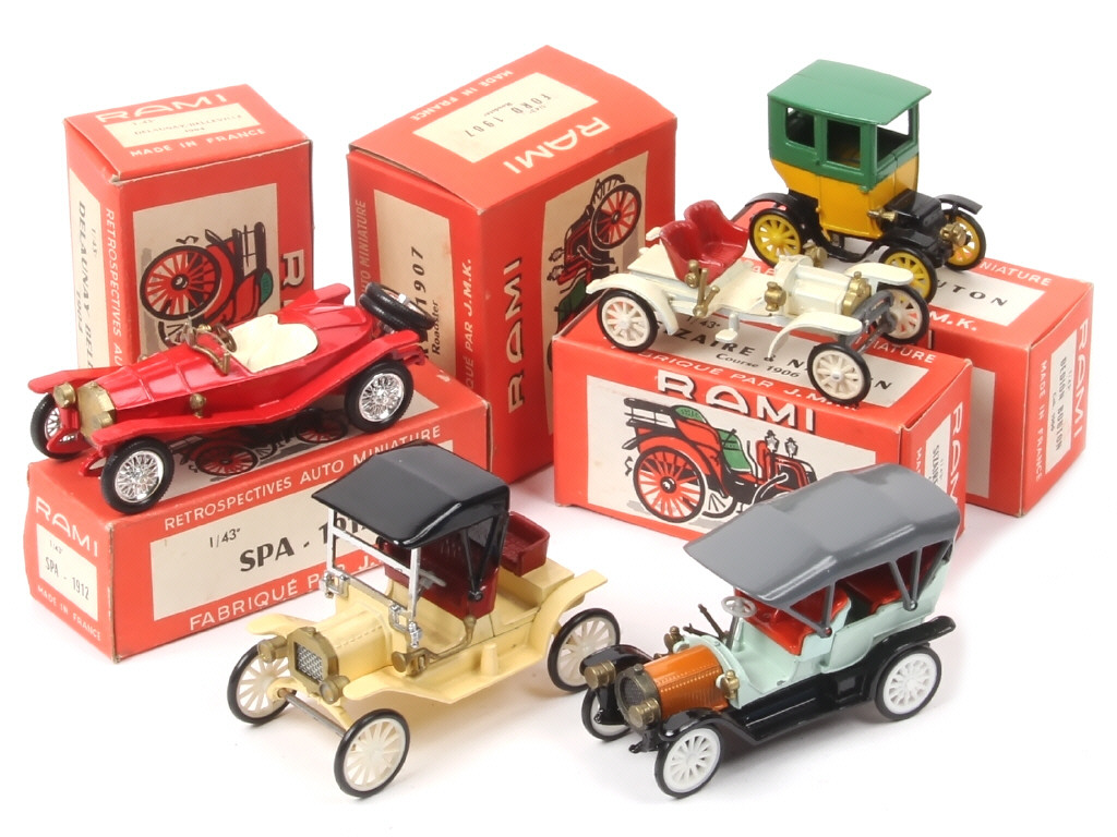 miniatures reproduisant les modèles : FORD, DELAUNAY BELLEVILLE, SIZAIRE & NAUDIN (état 'B' avec carrosserie ternie & tachée, manque volant), SPA (état 'A-') & DEDION BOUTON