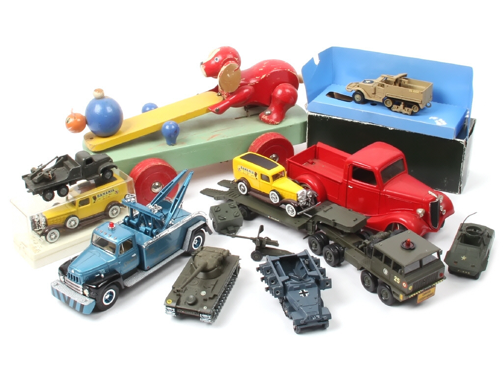 différentes échelles - on y retrouve notamment les marques : SOLIDO, STRETTON, FRANCE JOUETS & FIRST GEAR - on y joint un jouet en bois (état 'D') - avec manques, parties cassées & légères transformations sur certains exemplaires