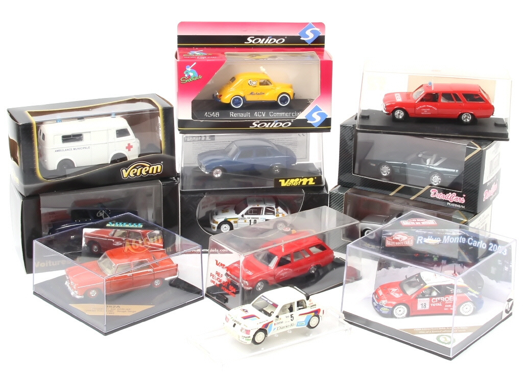 miniatures reproduisant notamment les modèles : PEUGEOT, FORD, RENAULT, CITROËN & CHEVROLET - on y retrouve notamment les marques : SOLIDO, VEREM, DETAILCARS & VITESSE