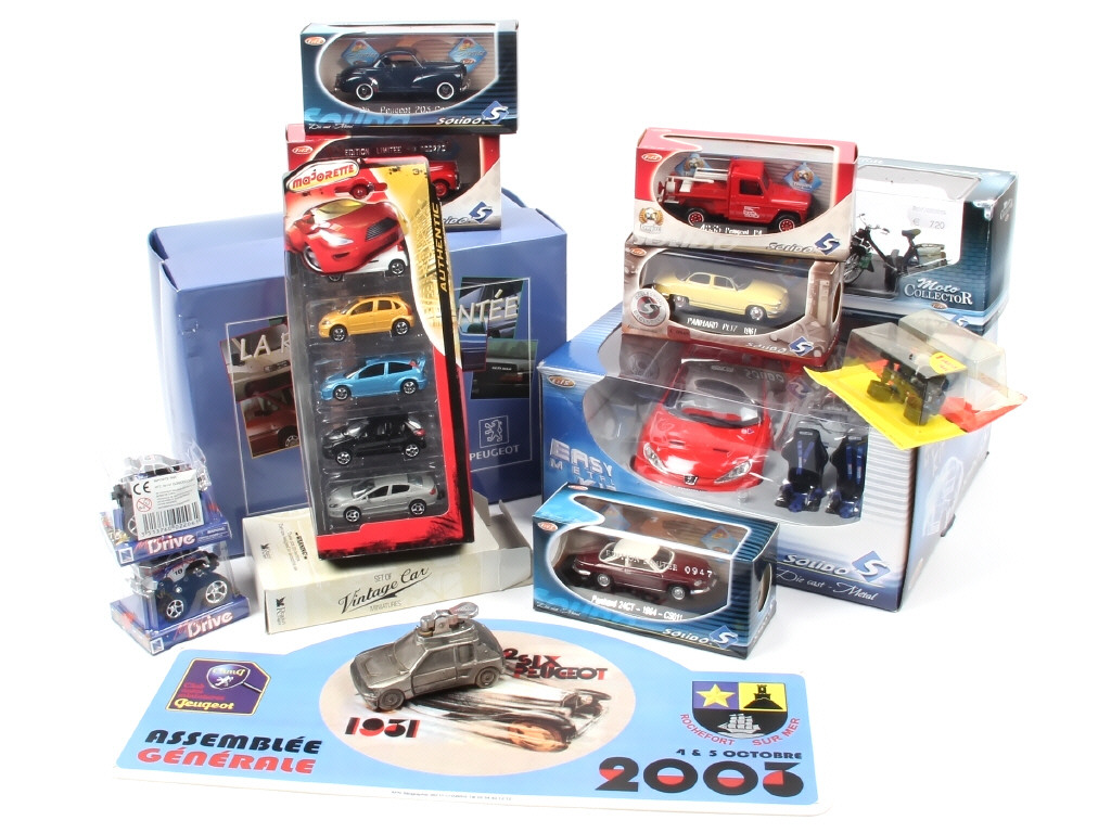 différentes échelles - miniatures reproduisant notamment les modèles : PEUGEOT, PANHARD, SOLEX & CITROËN - on y retrouve notamment les marque SOLIDO, MATCHBOX & MAJORETTE - on y joint un jeu de société 'LA ROUTE ENCHANTEE' - possibilité de petits manques & parties cassées - quelques véhicules sans boite