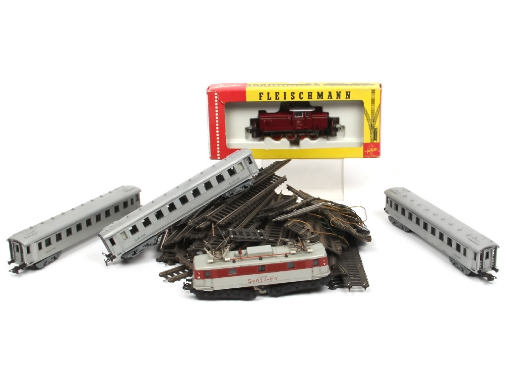 non testé - comprend : motrice diesel V60 1199 'DB' (boite en état 'd'), électrique E46 0701 DR 'SANTA FE' (avec petits manques & parties cassées - petites traces de peinture jaune sous le modèle) & voitures-voyageurs 'CLUB CAR' - on y retrouve notamment les marques : PIKO & FLEISCHMANN - quelques traces d'oxydation
