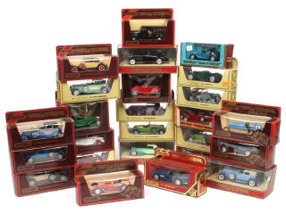 miniatures reproduisant notamment les modèles : DUESENBERG, STUTZ, CORD, MERCEDES & FERRARI - quelques petits accrocs sur certaines boites & possibilité de blisters plus ou moins abîmés