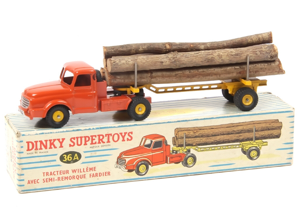 DINKY TOYS (FRANCE) 36A WILLEME Fardier (version avec jantes convexes & remorque ajourée) orange & jaune