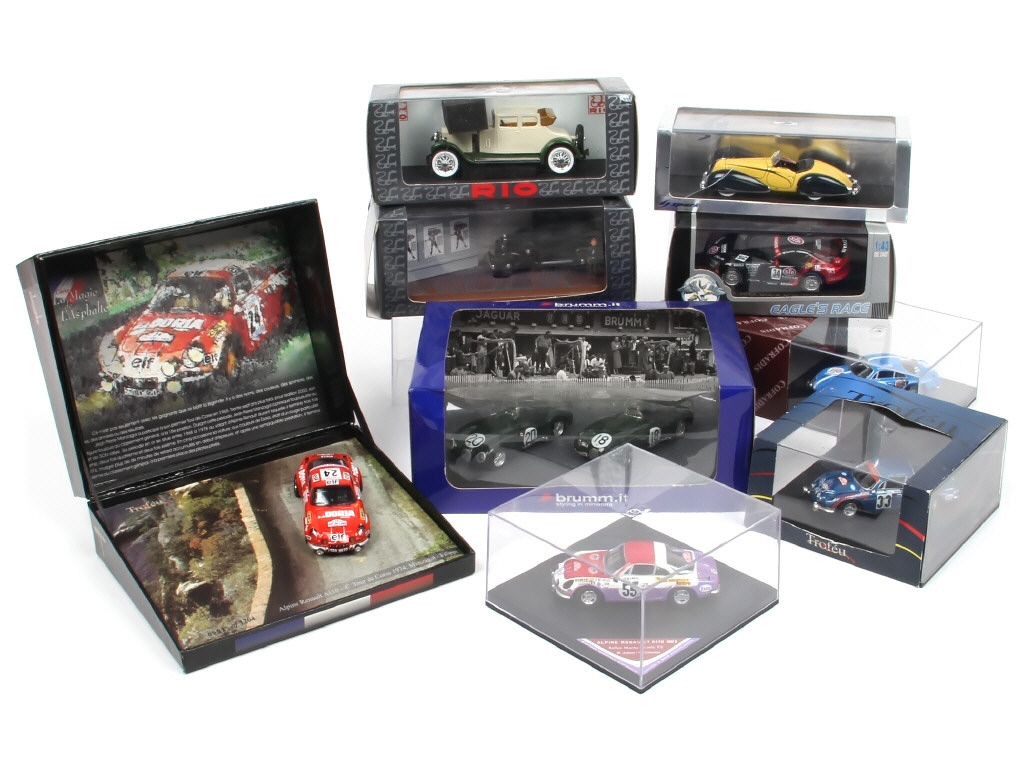 miniatures reproduisant notamment les modèles : JAGUAR, ALPINE RENAULT, TALBOT LAGO, DODGE, ROLLS ROYCE & FIAT (détaché de son socle) - on y retrouve les marques : UNIVERSAL HOBBIES, RIO, SPARK (coque de boite fêlée), TROFEU (2 modèles en série limitée) & BRUMM (blister décollé & boite déformée)