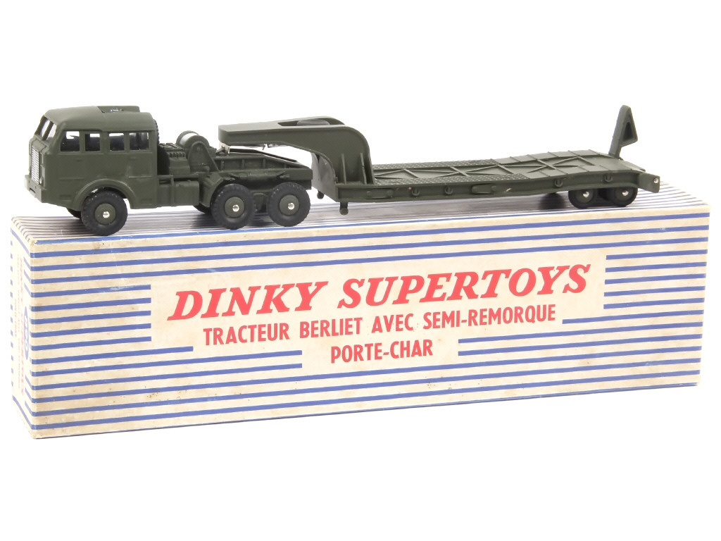 DINKY TOYS (FRANCE) 890 BERLIET Transport de char (version avec jantes du tracteur & de la remorque convexes) kaki