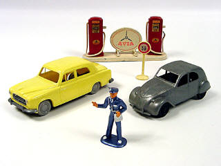 avec indicateur de débit & panneau publicitaire 'AVIA' amovible - on y joint un pompiste & un panneau de signalisation en plastique (de marque inconnue)
