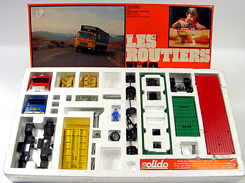 contient : un camion BERLIET, un camion SAVIEM, une benne basculante, une semi-remorque plateau & différents accessoires- complet - coffret permettant le montage de différents camions - SUPERBE !