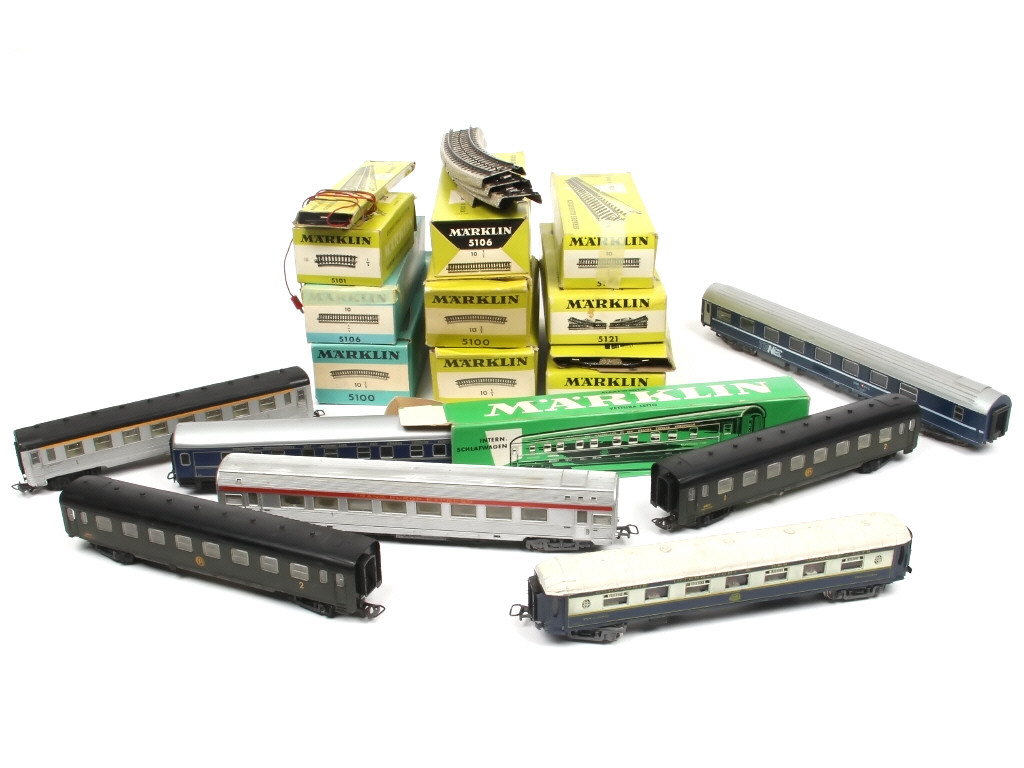 comprend notamment : rails droits, courbes, aiguillages & voitures-voyageurs - quelques manques & parties cassées