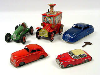 états de 'B' à 'D' - comprend : une MERCEDES F1 SCHUCO, un coupé aérodynamique (avec moteur à clef - fonctionne), un coupé fantaisiste TIMPO, une berline en tôle litographiée GEM & un tacot CIRCUS mécanique avec mécanisme de soufflerie sur la cheminée (fonctionne)
