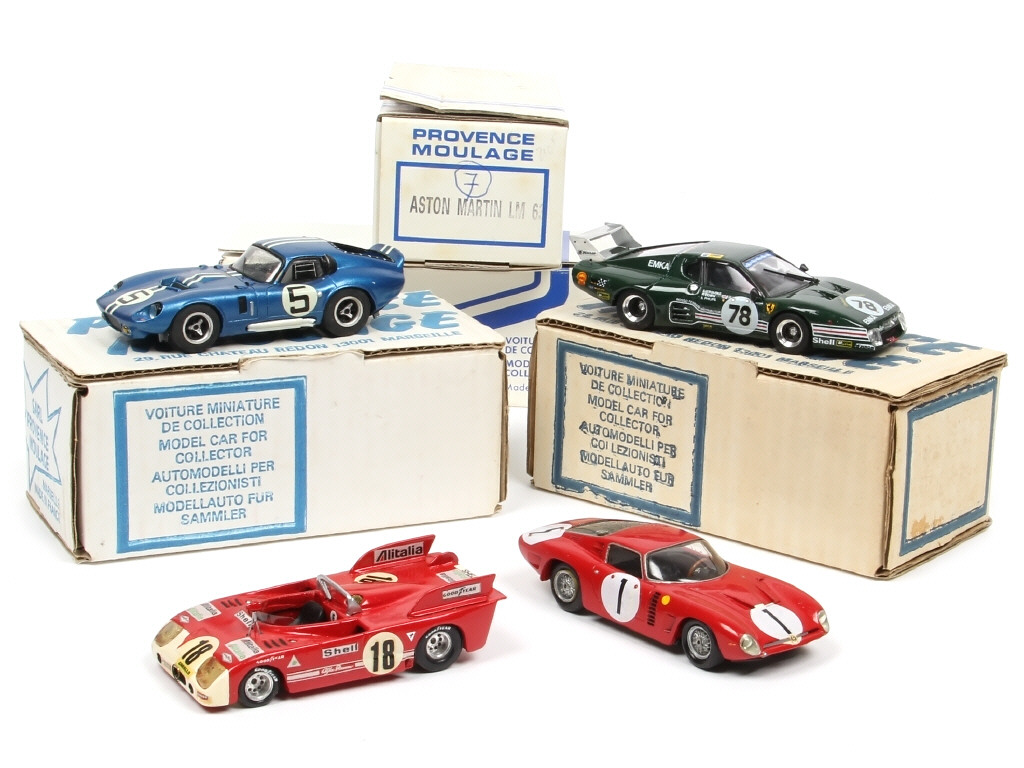 comprend notamment : BIZZARINI A3C Le Mans 1964, FORD COBRA DAYTONA & ALFA ROMEO33 - on y retrouve les marques : TRON, BRUMM, TENARIV & VROOM - avec possibilités de petits manques, parties cassées & éléments à refixer - boites non conformes de marque PROVENCE MOULAGE (états 'b' & 'c')