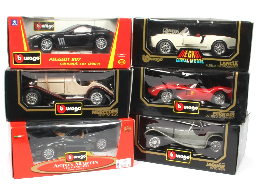 échelle 1/18ème - miniatures reproduisant les modèles : ASTON MARTIN, JAGUAR, MERCEDES, FERRARI, LANCIA & PEUGEOT - certaines boites encrassées