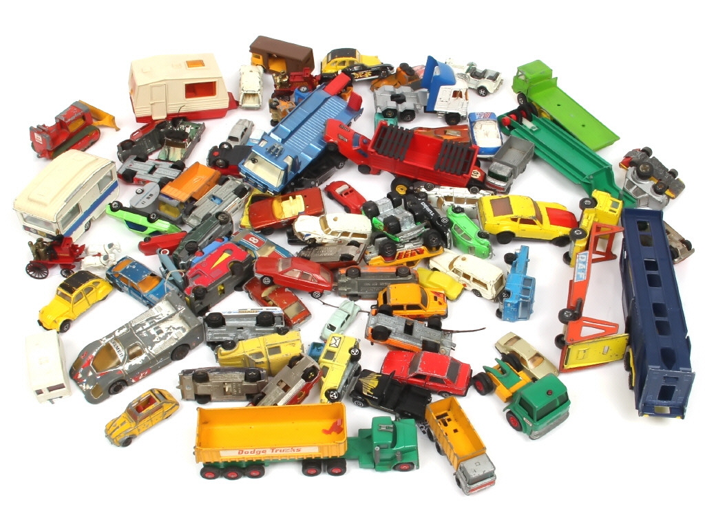 on y retrouve notamment les marques : MAJORETTE, MATCHBOX, CORGI TOYS & NOREV - avec manques & parties cassées