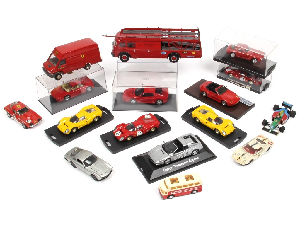 miniatures reproduisant notamment les modèles : IVECO, FIAT, PORSCHE, CHEVROLET & FERRARI - on y retrouve les marques : OLD CARS, STARTER, ONYX, HERPA, MOG MODELES (série limitée numéroté 2/200 exemplaires) - petits manques, parties cassées & carrosseries encrassées sur certains exemplaires