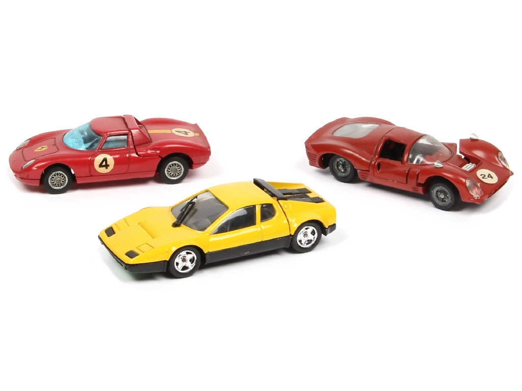 comprend les modèles : BB, BERLINETTA 250 Le Mans & P.4 (suspension affaissée) - carrosseries légèrement encrassées - on y retrouve les marques : SOLIDO, CORGI TOYS & MEBETOYS