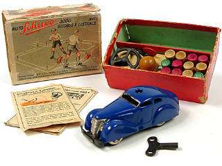 comprend : boîtier de commande avec volant, câble, clef, 2 panneaux de signalisation, une bille & 12 quilles en bois & 2 notices - moteur à clef (fonctionne)