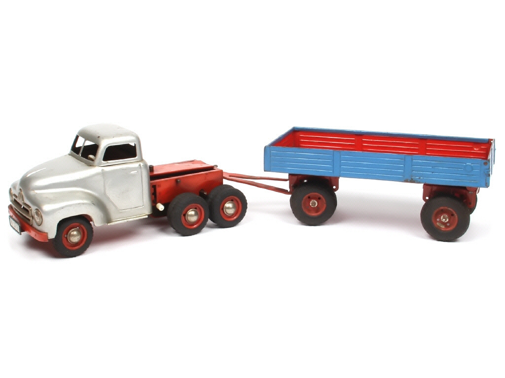 longueur 47 cm - avec moteur à clef (fonctionne) & direction - traces d'oxydation sur la remorque - pneus séchés - plus ou moins encrassé