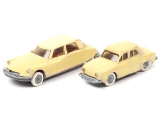 comprend les modèles : CITROËN DS (carrosserie & un axe de roues déformés) & RENAULT DAUPHINE (une extrémité de pare-chocs cassée & manquante) - importantes traces de moisissure avec parties métalliques ternies sur l'ensemble des modèles